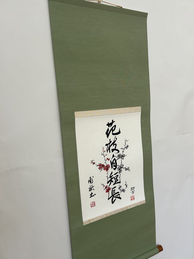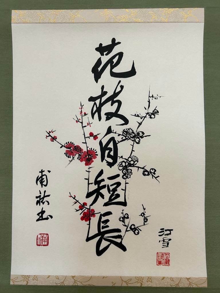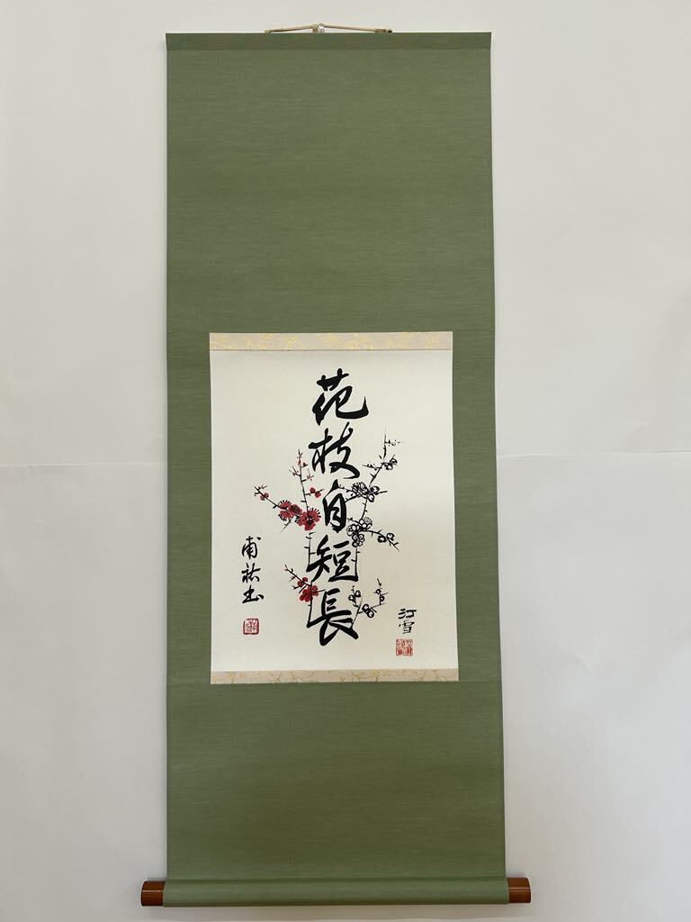 花枝には短い枝も、長い枝もありますが、それぞれの良さを生かして、全体として調和が取れているので、私たちもそれぞれがそれぞれらしく生きようと言う禅語に、水墨画家の小山汀雪先生に梅の絵を描いていただきました。